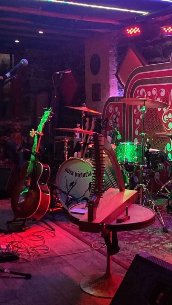 A stage sits in the middle, with instruments placed all over; an array of guitars, a harp on a small table, and a drum set, where a drawing of two ravens perched on leafless tree branches stands out, and the words “Adia Victoria” written at the forefront.